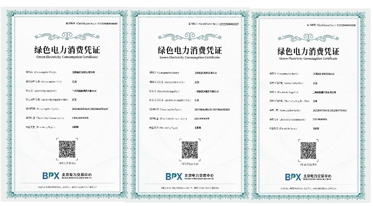 2022年,江阴福汇公司获得北京电力交易中心颁发的绿色电力消费凭证,本年度消费绿电408万千瓦时,相当于减少二氧化碳排放2300吨,为国家实现“双碳”战略目标努力做出自身贡献。